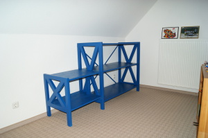 Es war zwar alles gut verarbeitet, doch die Verwendung von Restholz hierbei lies es nicht zu das Regal in natur zu belassen. Somit durfte Max sich eine Farbe aussuchen in der es dann lackiert werden sollte.